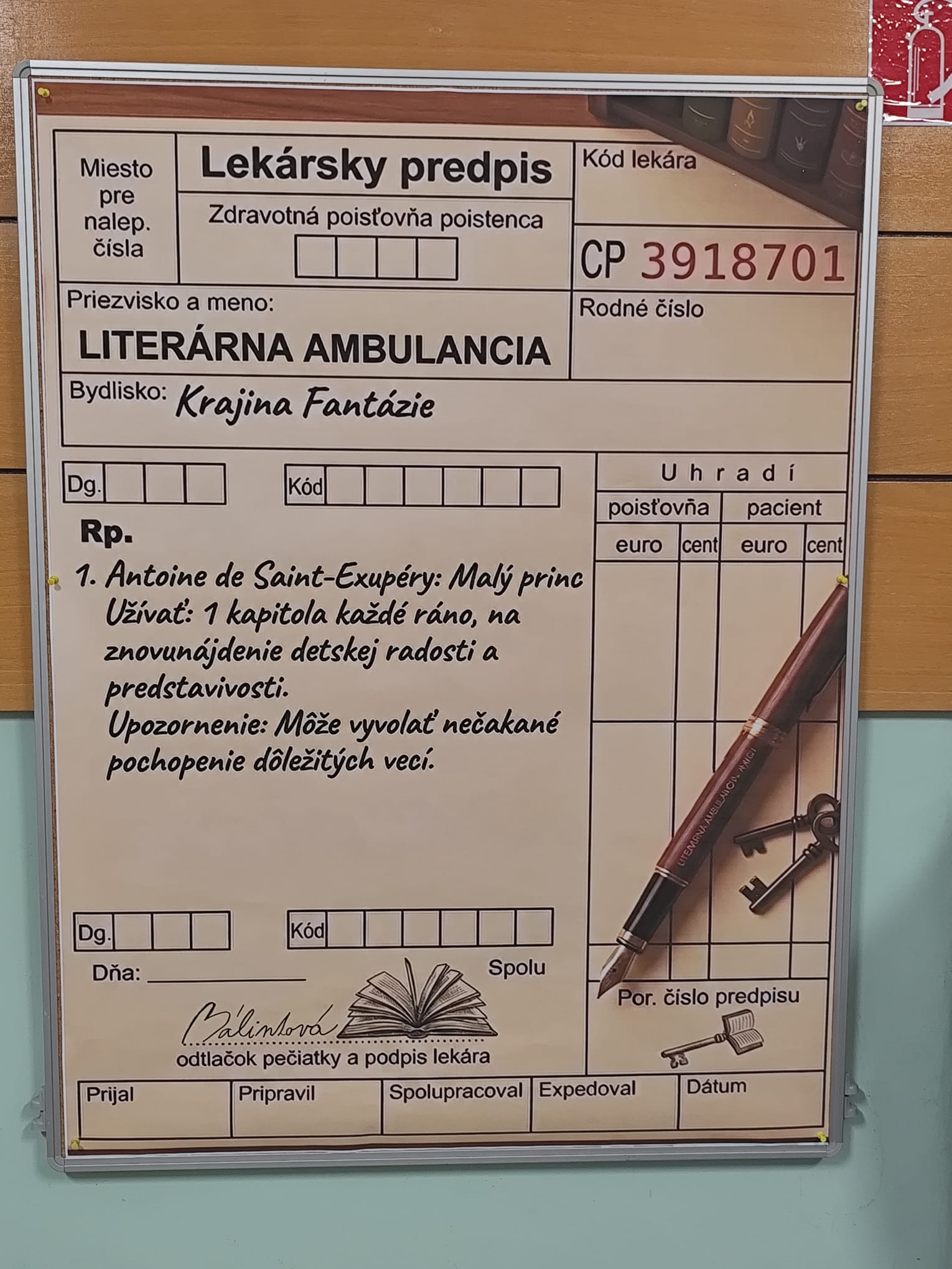 Poznáte lekársky predpis na chorú dušu ? V literárnej ambulancii na adrese Krajina fantázie by vám predpísali určie miesto lieku KNIHU.