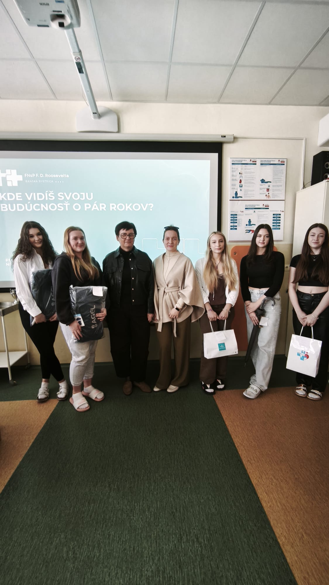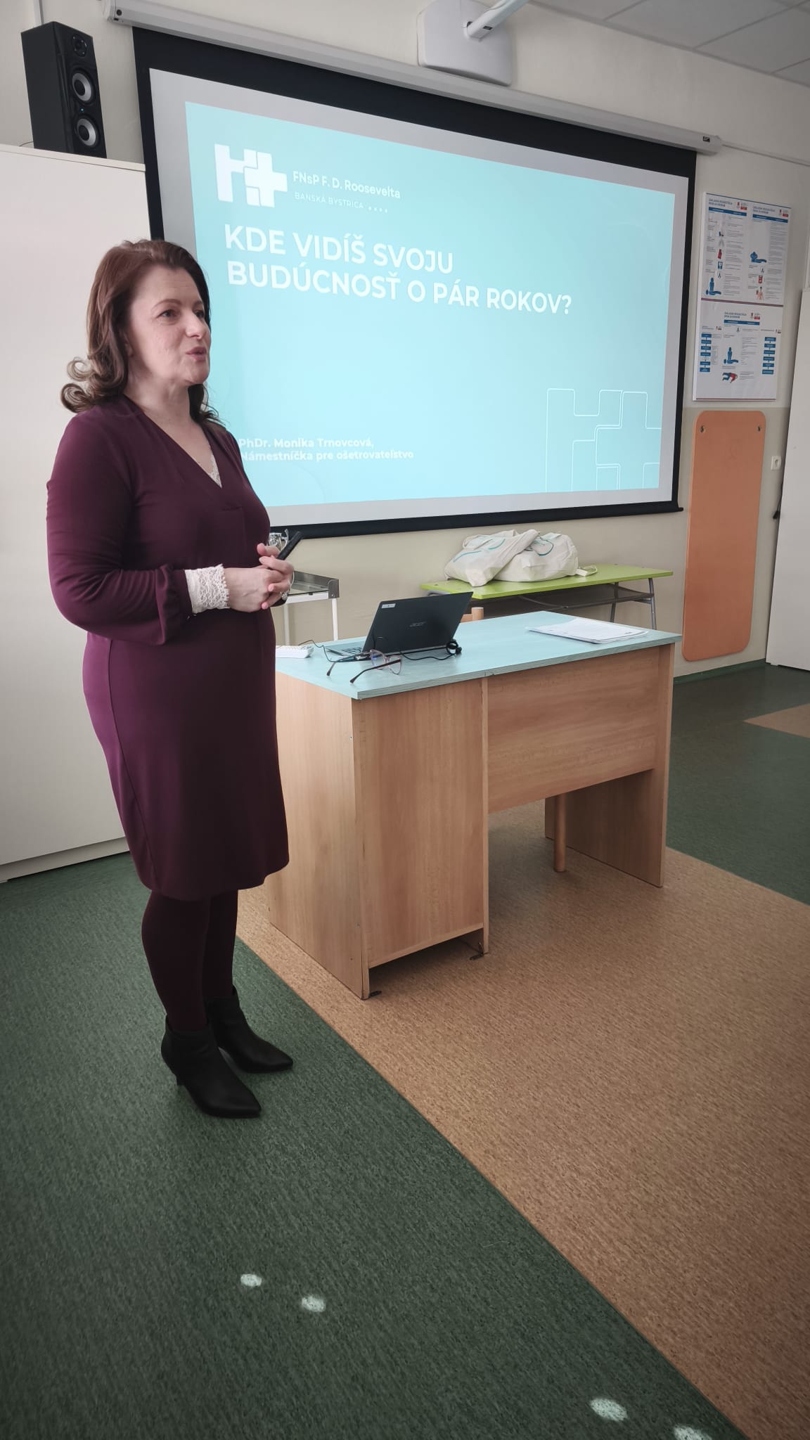 V týchto dňoch nás navštívila námestníčka FN F.D. Roosevelta s cieľom predstaviť jednu z najmodernejších nemocníc na Slovensku a ukázať študentom končiacich ročníkov, že ich odborný rast má v regióne silné zázemie. Počas prezentácie mali študenti možnosť nahliadnuť do zákulisia fungovania a rekonštrukcie „Rooseveltky“. Najzaujímavejšou časťou pre študentov boli konkrétne pracovné ponuky a benefity, ktoré nemocnica ponúka novým kolegom. Študenti sa aktívne zaujímali o podmienky nástupu i o možnosť skĺbenia práce s ďalším vysokoškolským štúdiom. Naši študenti odchádzali zo stretnutia s vedomím, že dvere do ich profesionálneho života sú v Banskej Bystrici otvorené dokorán.