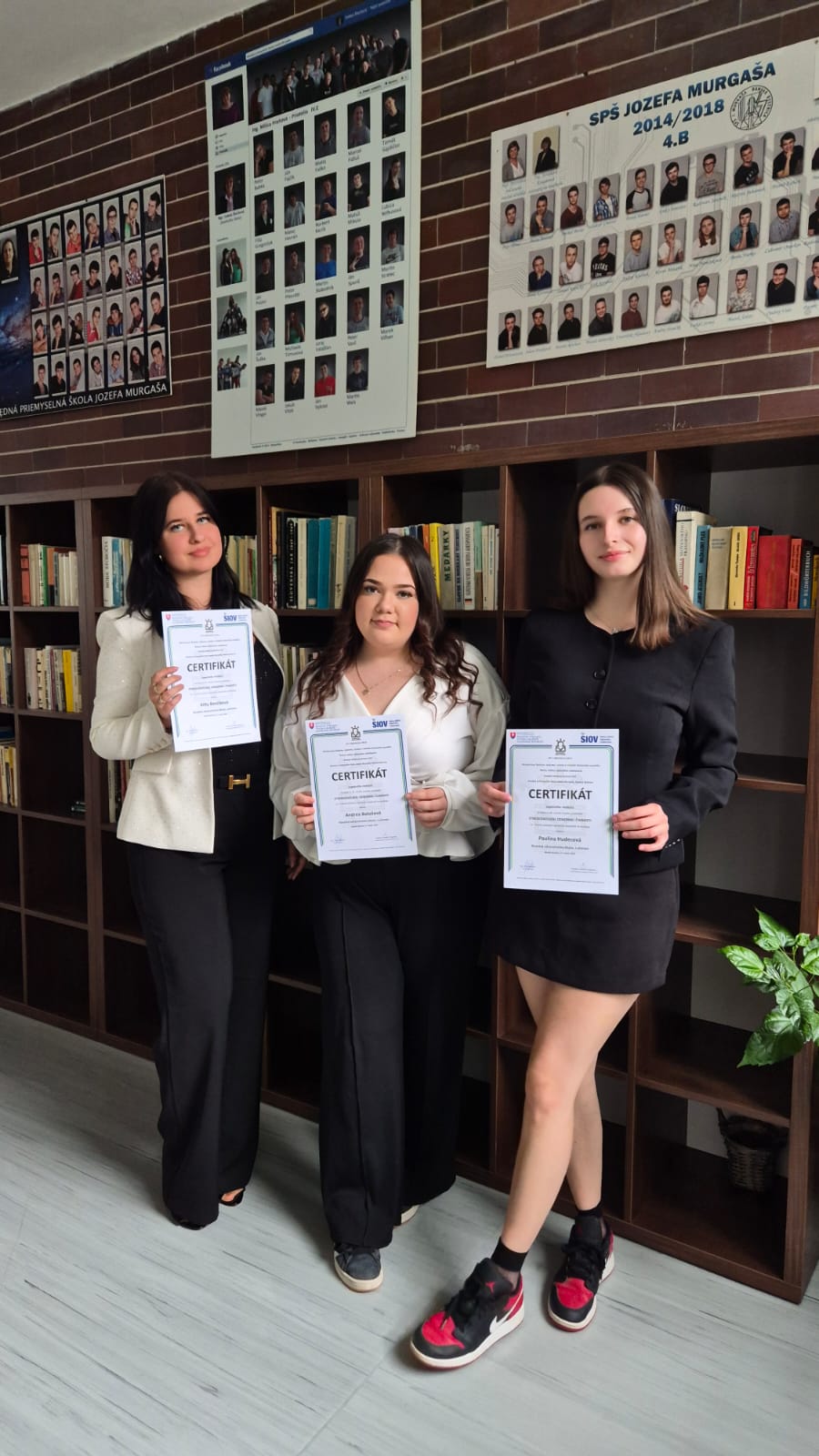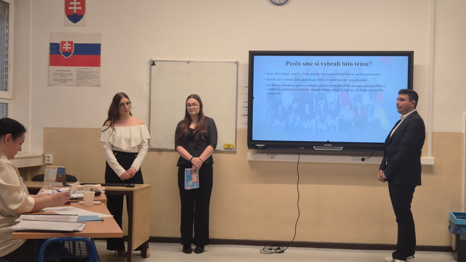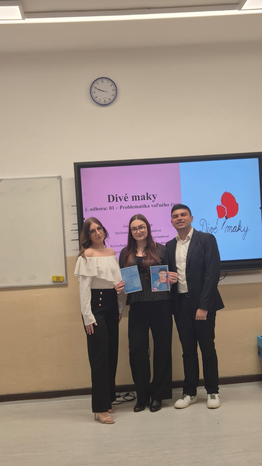 Arpád Balog, Tereza Halgašová, Alexandra Csernoková (3.B) s prácou Divé maky